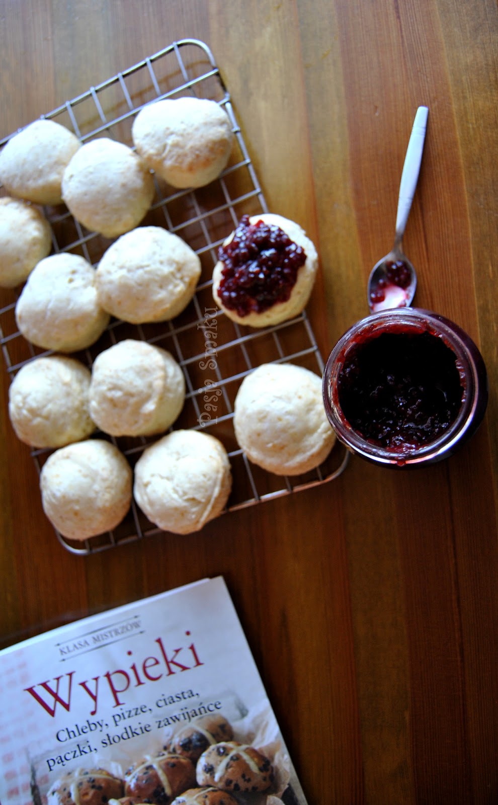 Resztki ciastka ponownie zagnieść, rozwałkować i wyciąć kolejne krążki. Smarować je pozostałym mlekiem i posypywać cukrem. Piec przez 12-15 minut lub do chwili, gdy ładnie wyrosną, zrumienią się i będą od spodu wydawać głuchy odgłos.