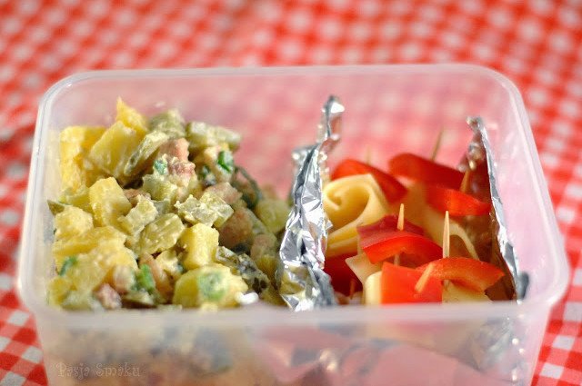 Od czasu do czasu robię sobie do pracy takie „pudełeczka”. Najczęściej są to sałatki i jakieś dodatki. Sałatka ziemniaczana jest sycąca i bardzo ciekawa w smaku. Jako, że jeszcze nie zaopatrzyłam się w takie specjalne pudełko na lunch z przegródkami,