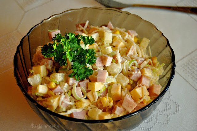 Dzisiaj prezentuję Wam przepis na prostą w wykonaniu sałatkę na różne imprezy i wydarzenia. Jej składniki są łatwo dostępne i popularne. Zapraszam do krojenia 🙂 Składniki: 1 puszka ananasa 1 słoik selera 1 puszka kukurydzy 20 dag sera żółtego 20