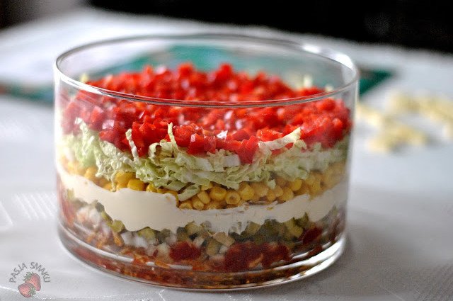 Sałatka warstwowa zawsze pojawia się na naszym stole przy okazji świąt i różnych uroczystości. Może dlatego, że ładnie prezentuje się w szklanej salaterce? Dobre połączenie smaków, myślę, że każdemu powinno się spodobać. Składniki: podwójna pierś z kurczaka cebula