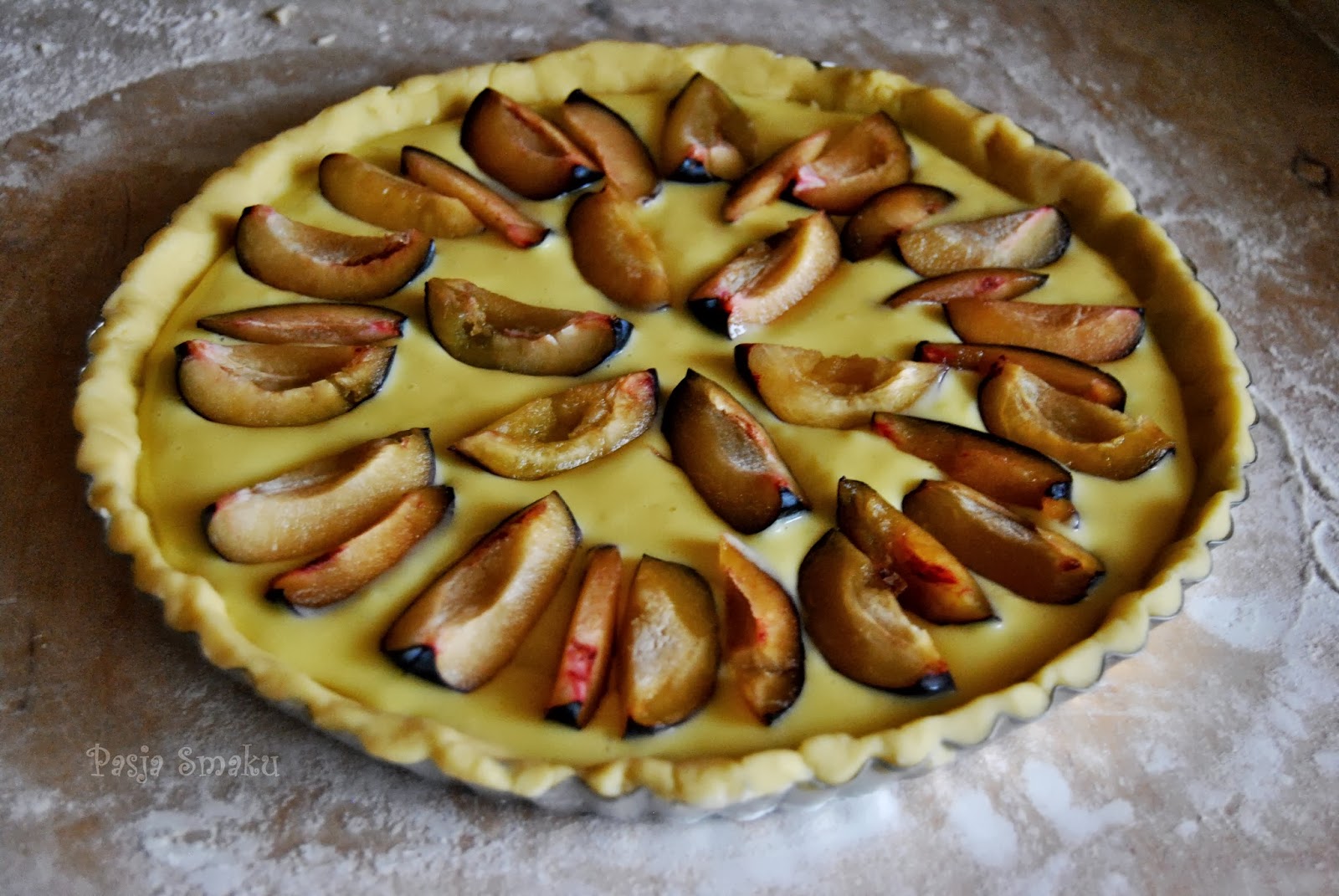 Schłodzone ciasto rozwałkować, wyłożyć nim formę do tarty. Na ciasto wylać masę budyniową, na której trzeba ułożyć ćwiartki śliwek.