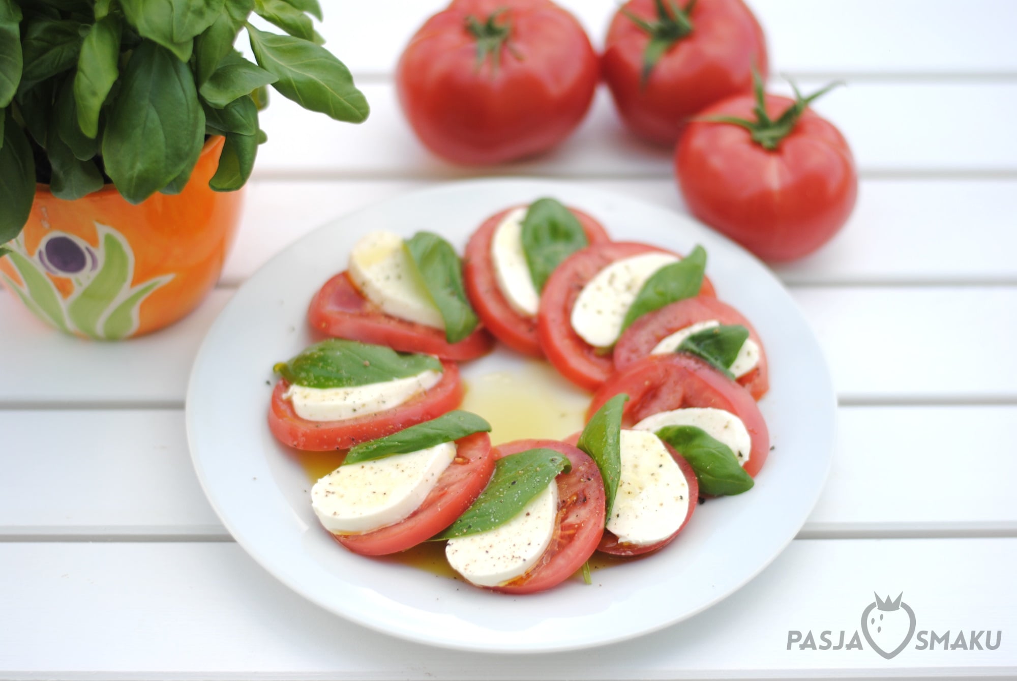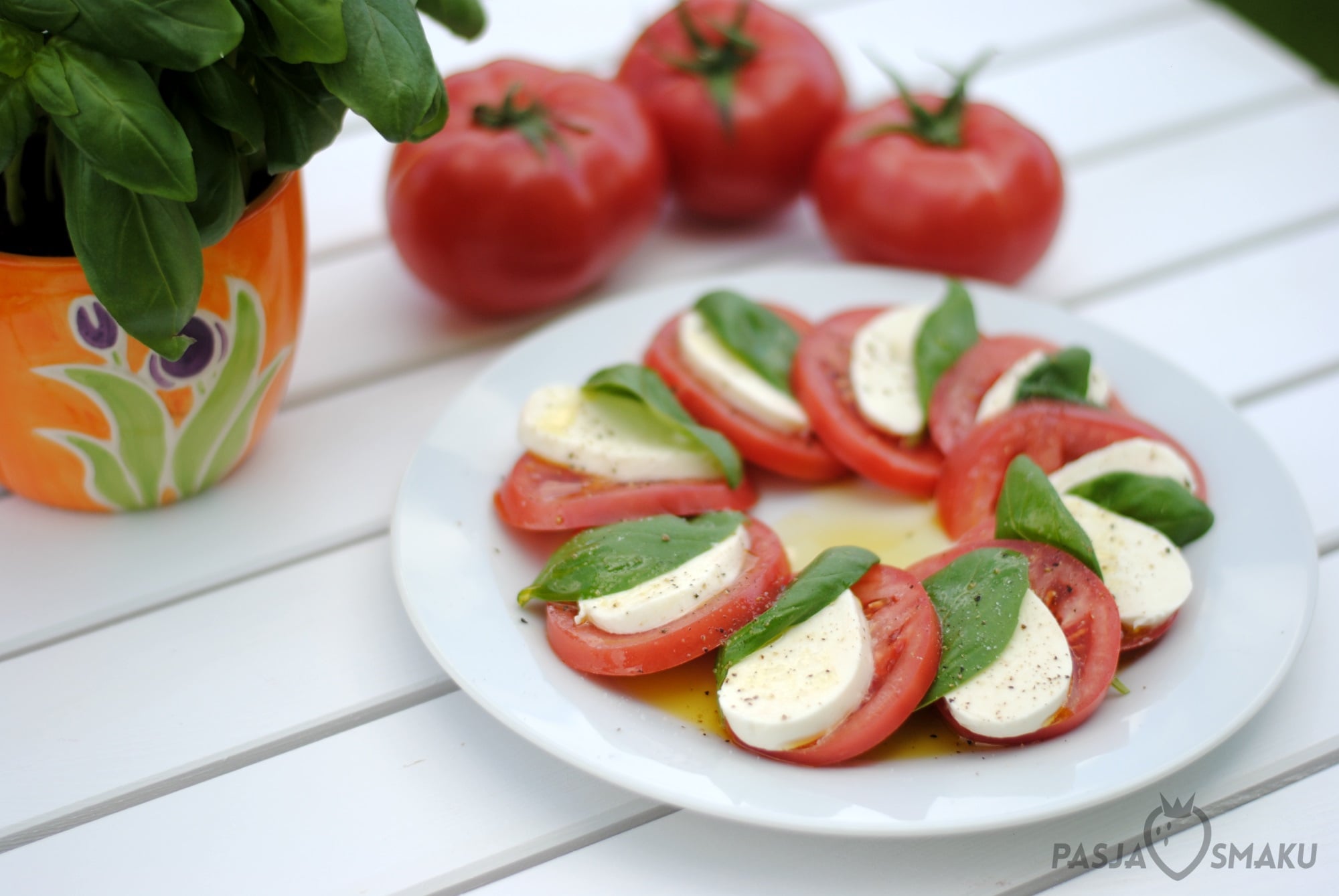 Pomidory i mozzarellę pokroić w plastry. Układać na talerzu na przemian pomidory, mozzarellę i listki bazylii. Polać oliwą i posypać świeżo zmielonym pieprzem.