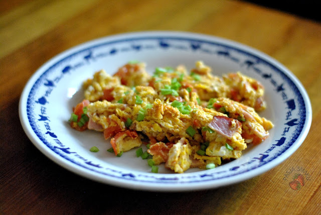 Bardzo lubię jajecznicę w tej wersji – oczywiście usmażoną na maśle i posypaną świeżym szczypiorkiem. Do tego bułeczka i herbata z cytryną. Pyszny początek dnia. Składniki: 3 jajka 2 plasterki szynki 1 łyżka masła klarowanego 1 pomidor sól, pieprz szczypiorek