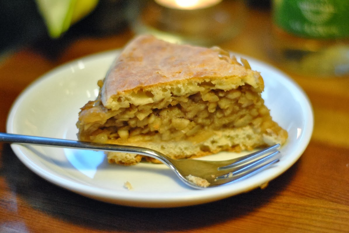 Druga wizyta minęła pod znakiem zupy rybnej na ostro (10 zł), o której marzyłam od pierwszej wizyty. Polecała nam ją też kelnerka – więc z pewnością jest to specjalność restauracji. Postanowiliśmy zamówić także filet z jesiotra (10 zł/100 g)– nigdy nie próbowałam tej ryby, więc nie mogłam sobie jej odmówić. Sugerując się jednak ceną zupy (domyśliliśmy się, że może być sycąca), zdecydowaliśmy się zamówić drugie danie na pół. na deser spontaniczna decyzja – kawałek jabłecznika (6zł/szt) – jednak nie jest to chyba stała pozycja w menu, bo przy pierwszej wizycie go nie było. W każdym razie był bardzo dobry.