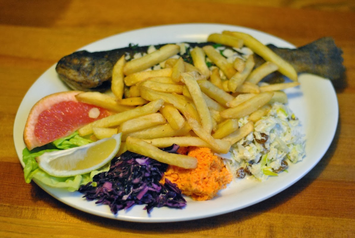 Ja zamówiłam wędzonego pstrąga (36 zł/kg), mój Mąż dużą porcję smażonego pstrąga (18 zł/szt), a kolega smażonego dorsza (9 zł/100g). Do każdej rybki (prócz dorsza) zamówiliśmy frytki (5 zł) i zestaw surówek (4,5 zł). Na dania mimo tak dużego ruchu nie czekaliśmy zbyt długo.