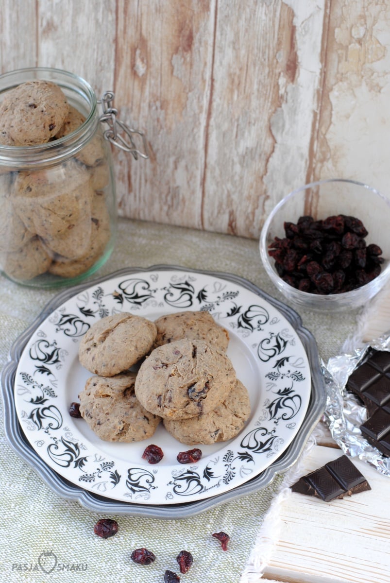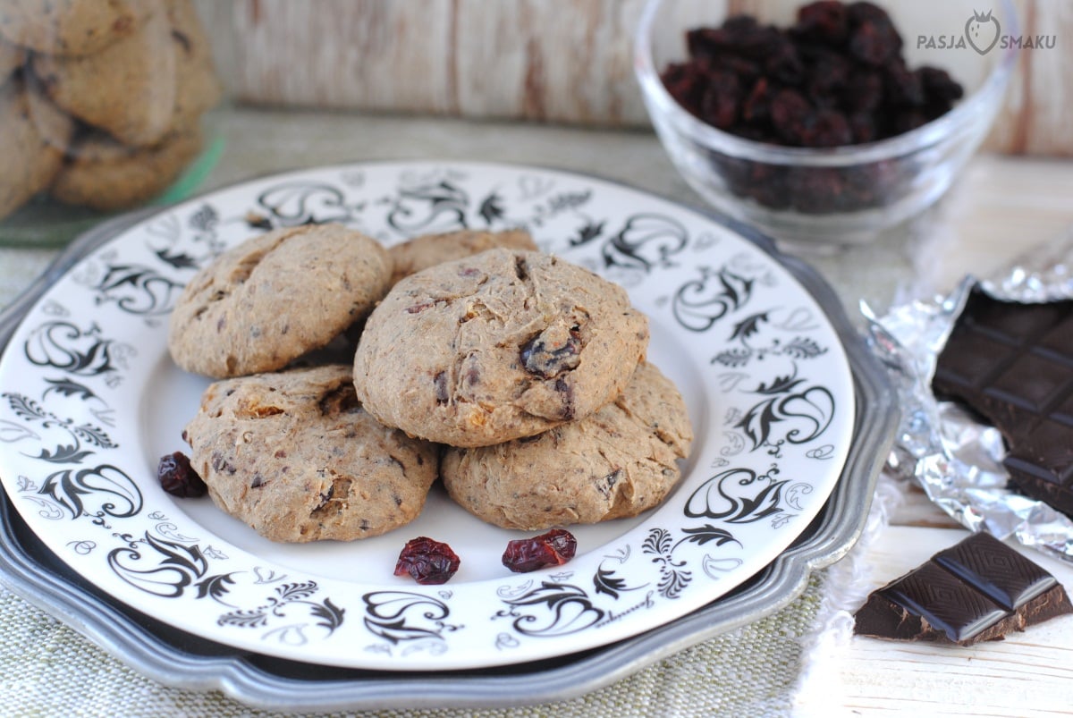 Mąkę przesiać do miski, dodać masło, młóto, proszek do pieczenia i jajka. Czekoladę i suszone owoce należy posiekać na drobne kawałki. Wszystkie składniki wymieszać i wyrobić ciasto. Powinno być dość gęste, a jeżeli zbyt mocno się klei należy dosypać do niego mąki.