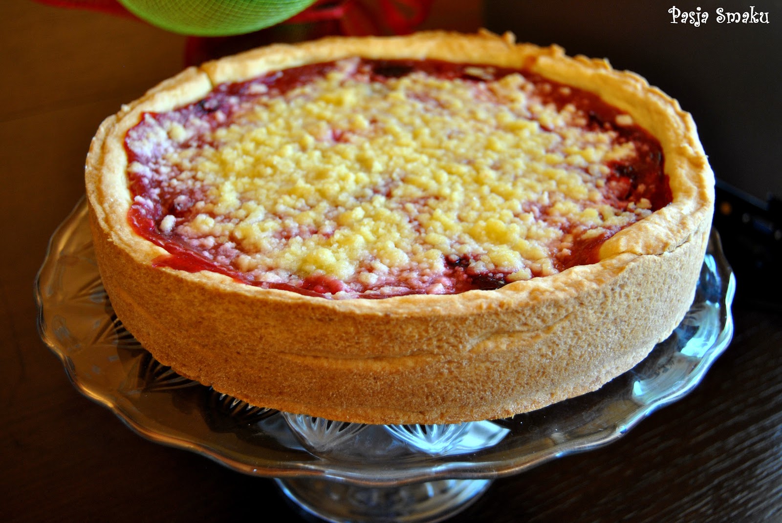 5. Z reszty ciasta wyłożyć ścianki formy. Wlać krem i posypać go kruszonką. Ciasto dopiekać przez 40 minut w temperaturze 180 st.C.