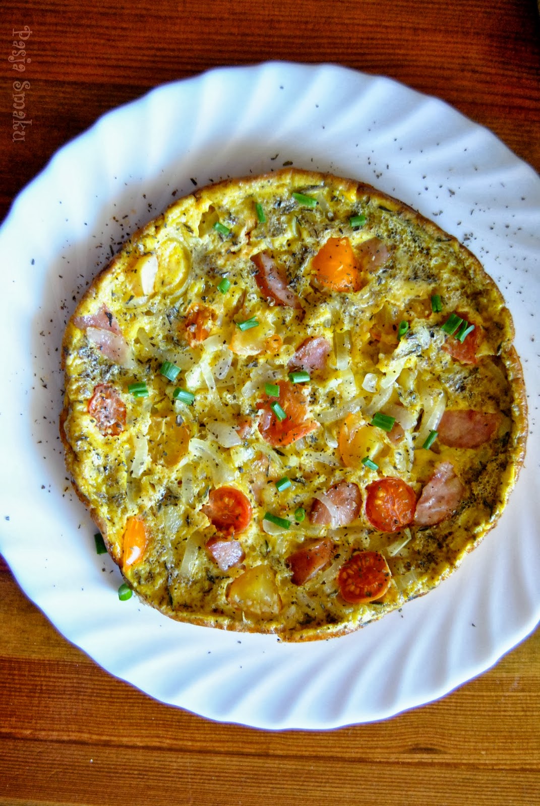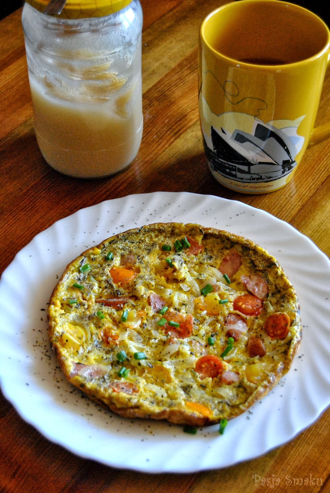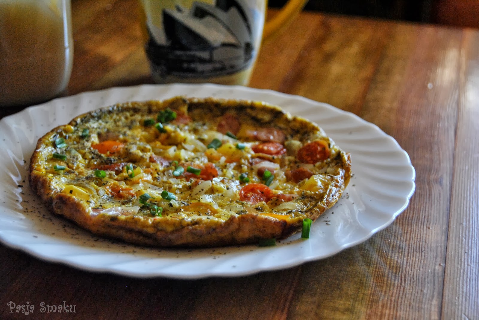 Jajka rozkłócić widelcem z dodatkiem soli i pieprzu. Cebulę drobno posiekać, podsmażyć na patelni, a następnie dodać plasterki kiełbasy. Po ok 2-3 minutach wlać na patelnię masę jajeczną i poukładać w niej przekrojone na pół pomidorki koktajlowe.