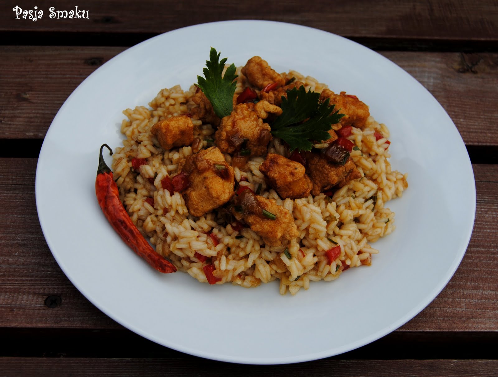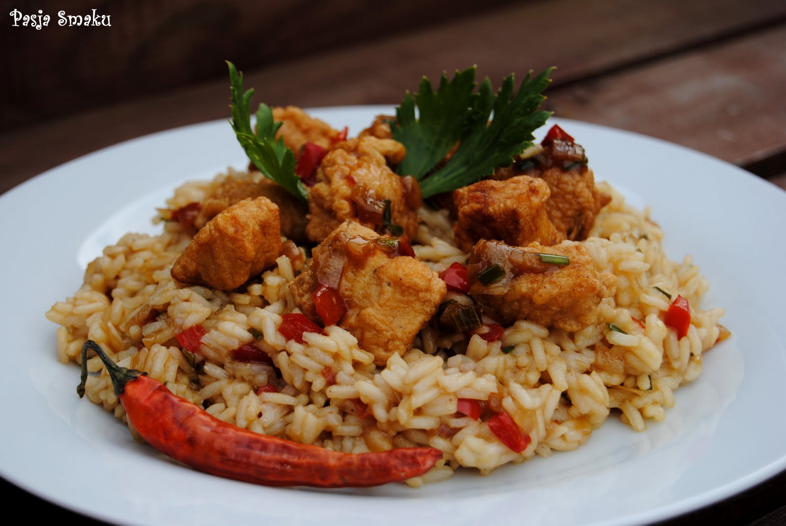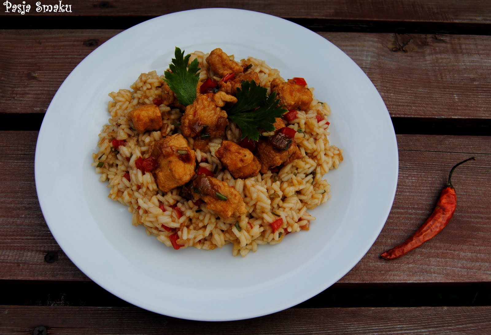 Jajka z mąką, winem, chili i sosem sojowym wymieszać na gładkie ciasto. Wrzucić do niego rybę i starannie w nim obtoczyć. Olej rozgrzać w woku lub małym garnku i smażyć rybę porcjami przez ok. 3 minuty, do przyrumienienia. Po usmażeniu wyłożyć ją na papierowe ręczniki, żeby ociekła z tłuszczu, następnie przełożyć w ciepłe miejsce.