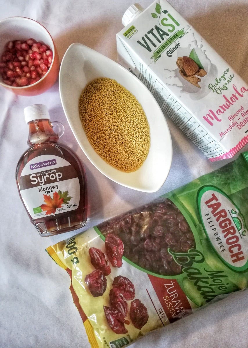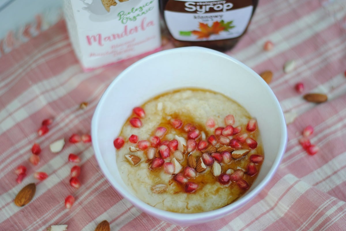 Jaglanka migdałowa z syropem klonowym, granatem i migdałami