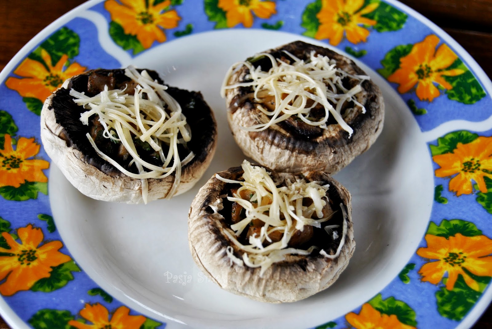 Kapelusze napełnić podsmażonym farszem i posypać startym żółtym serem.