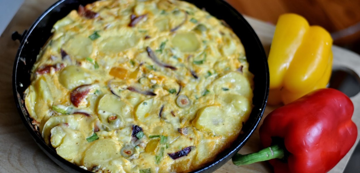3-4 ugotowane i pokrojone w kostkę ziemniaki, 6 jajek, parę oliwek, trochę pokruszonej fety i srrrru na patelnię. Nie zapiekam, bo się pięknie ścina i tak, gdy z obu stron usmażę )