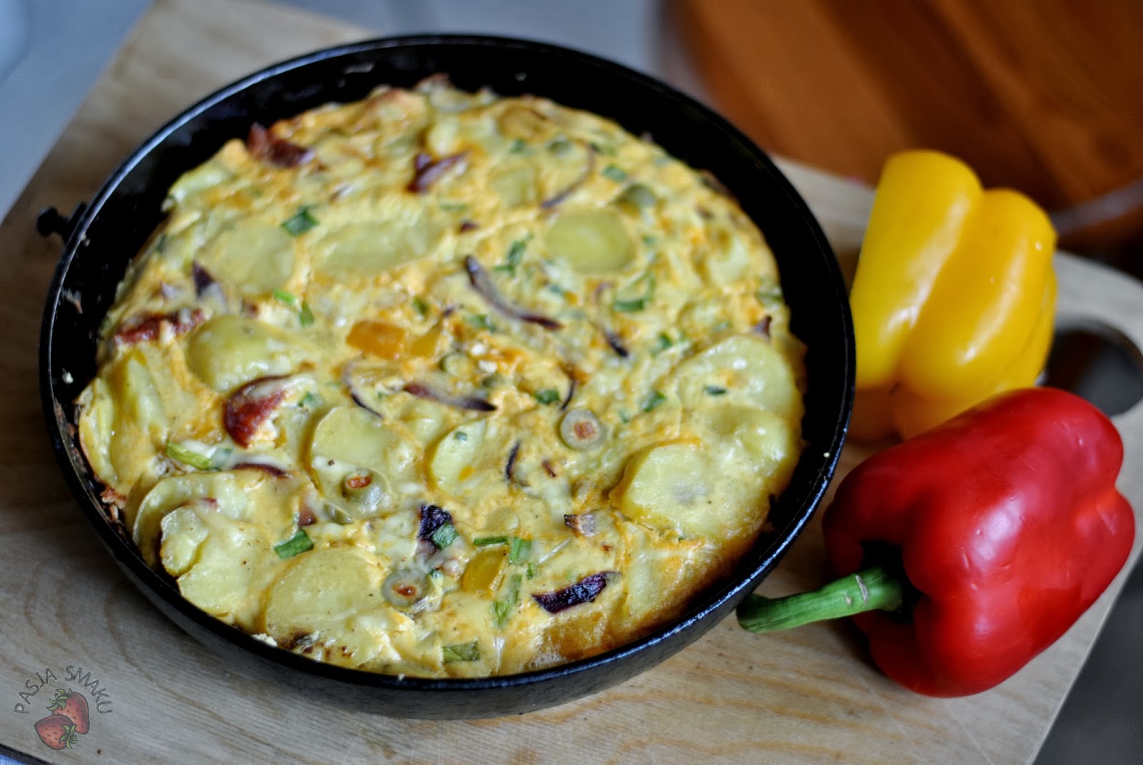 3-4 ugotowane i pokrojone w kostkę ziemniaki, 6 jajek, parę oliwek, trochę pokruszonej fety i srrrru na patelnię. Nie zapiekam, bo się pięknie ścina i tak, gdy z obu stron usmażę )