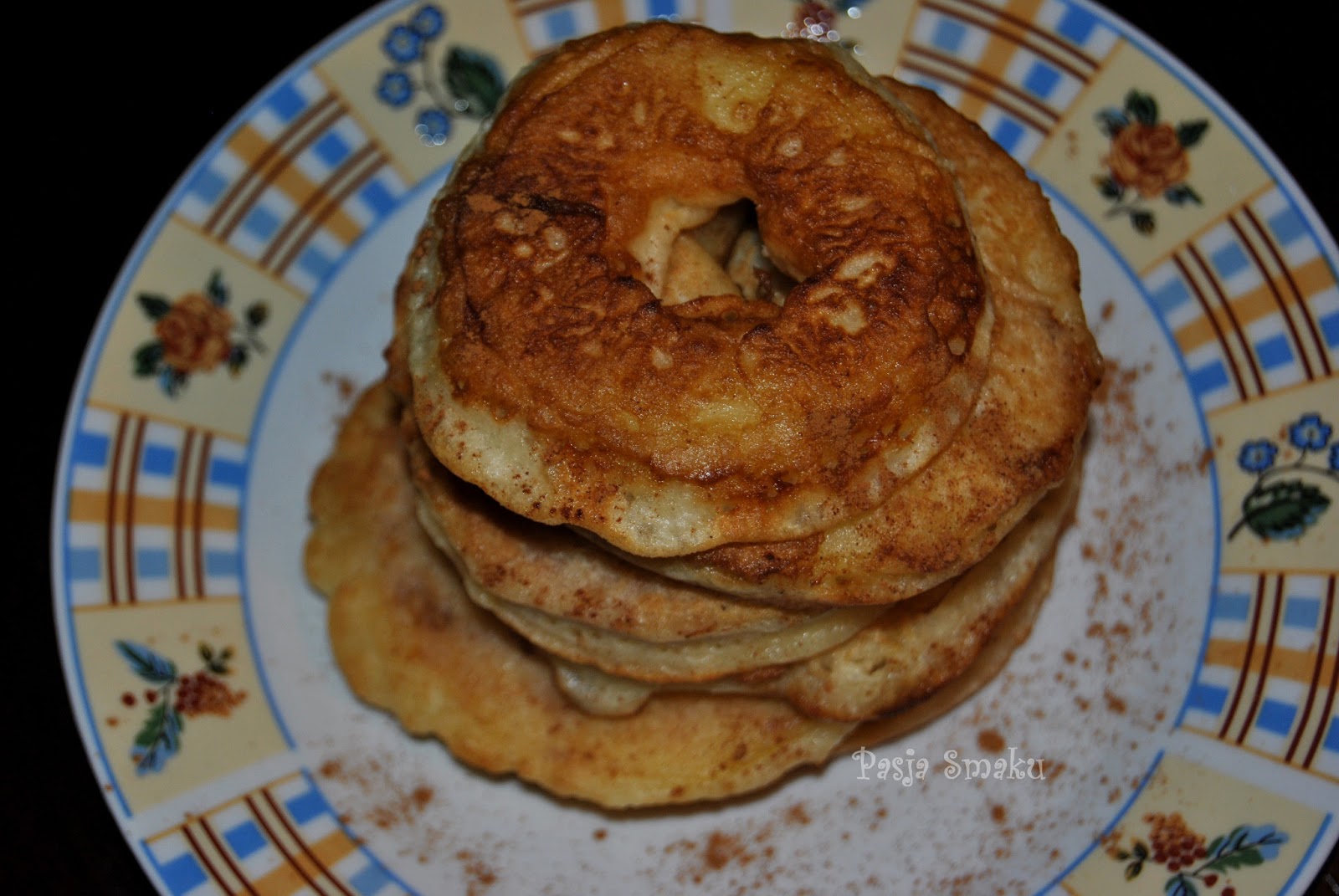 Składniki ciasta naleśnikowego starannie połączyć. Zanurzać w nim plastry jabłek i smażyć na rozgrzanym oleju. Odsączać na ręczniku papierowym.