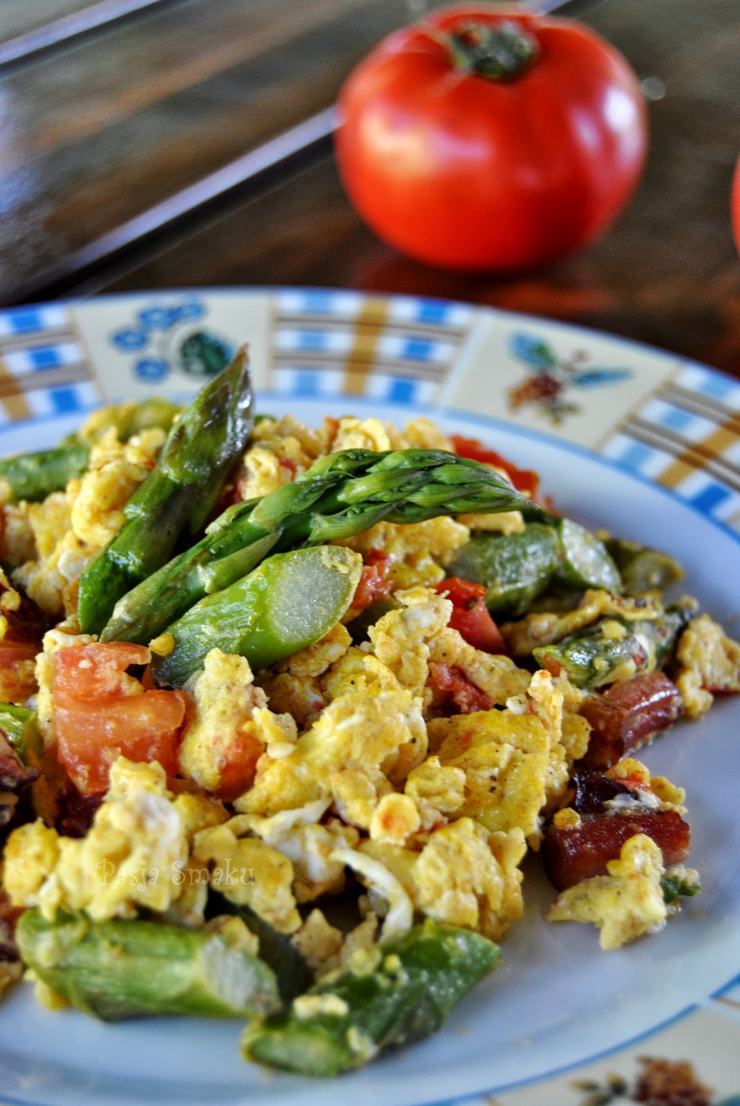 Boczek pokroić w paseczki lub kostkę, podsmażyć na patelni. Dodać do niego pokrojone w kawałki (2-3 cm) szparagi, które wcześniej trzeba ugotować na parze. Na koniec dodać pokrojonego w kostkę pomidora.