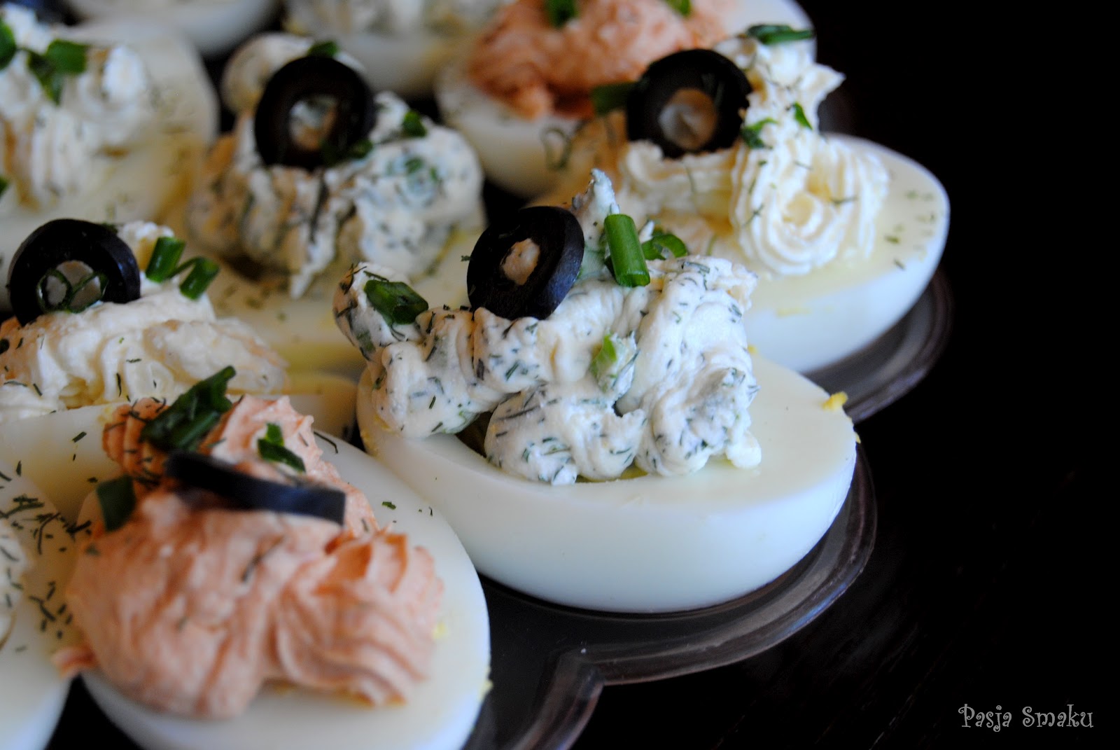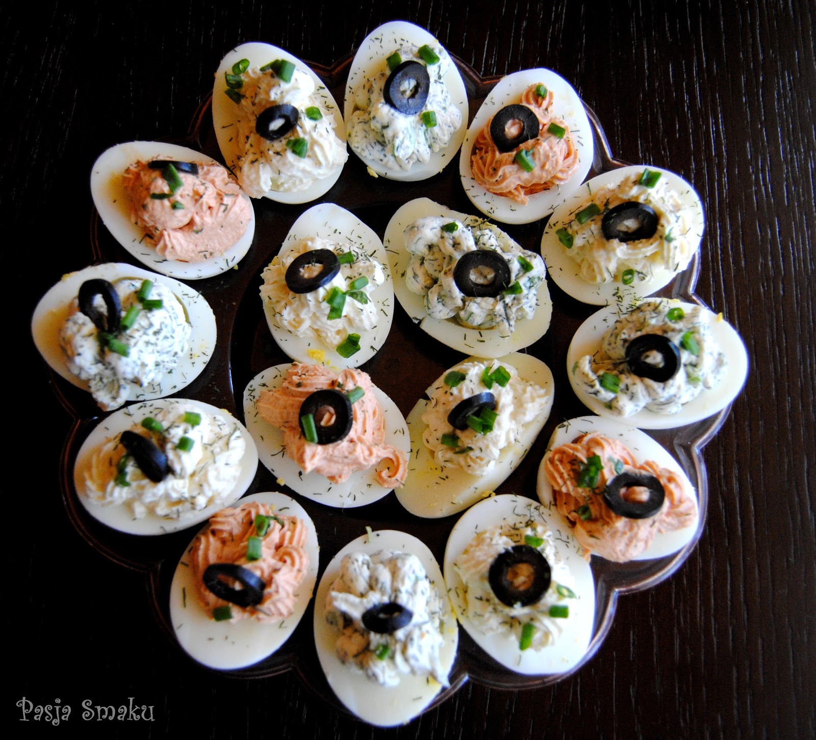6. Każdą z mas nakładać łyżką do szprycy i napełnić nią połówki białek. Faszerowane jajka posypać pokrojonym szczypiorkiem i ozdobić plasterkami czarnych oliwek.