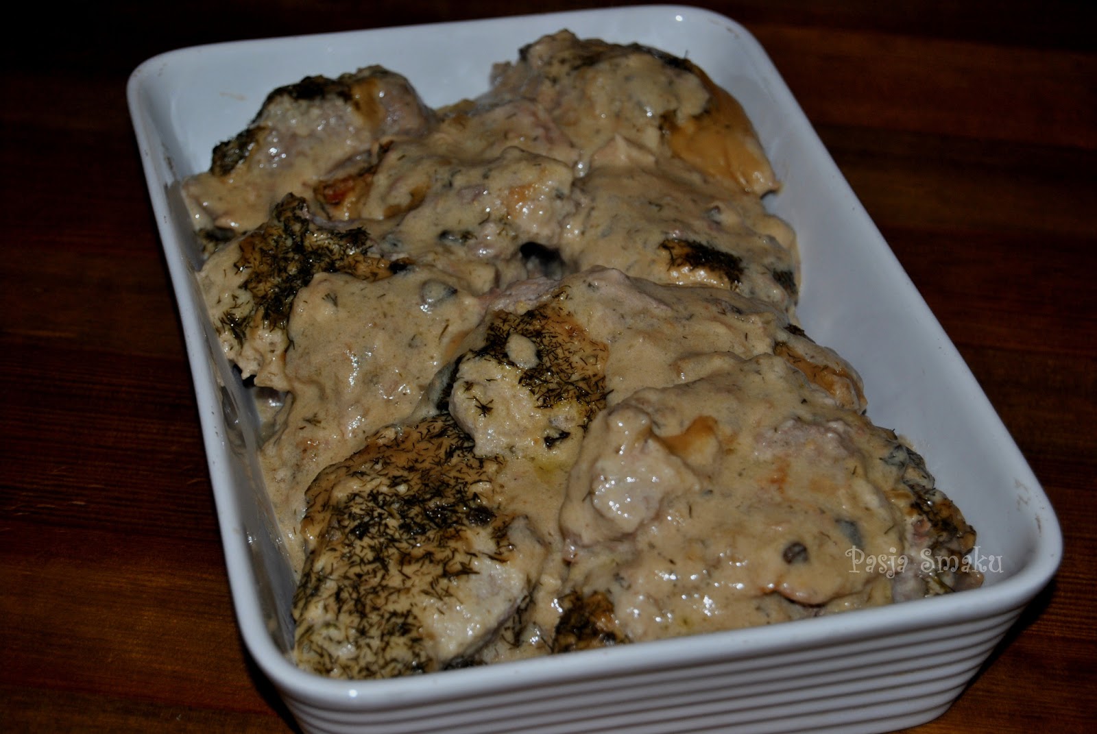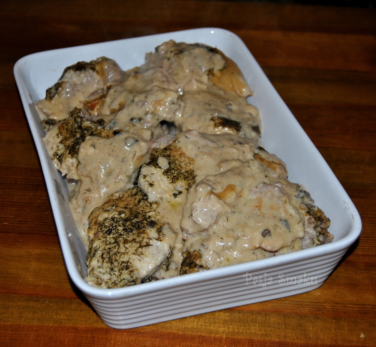 Pokrojone mięso ułożyć w brytfance lub naczyniu żaroodpornym i posmarować przygotowaną wcześniej śmietaną.