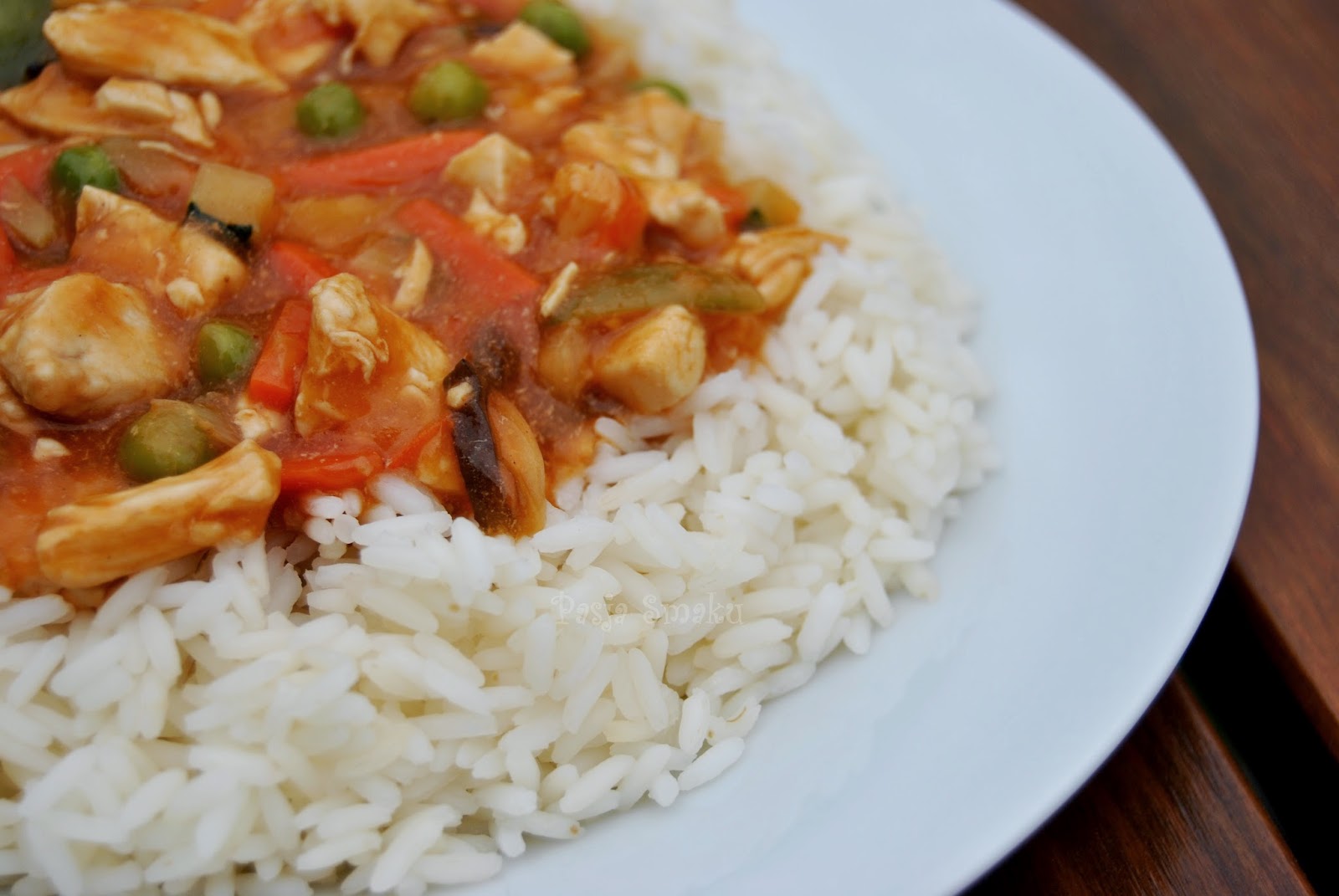 W woku rozgrzać niewielką ilość oleju, przełożyć do niego zamarynowanego kurczaka i podsmażyć. Gdy będzie prawie gotowy dodać do niego mieszankę chińską. Podlać wodą i przykryć pokrywką.Gdy warzywa będą miękkie, dodać koncentrat pomidorowy i doprawić do smaku: solą, pieprzem i chili.