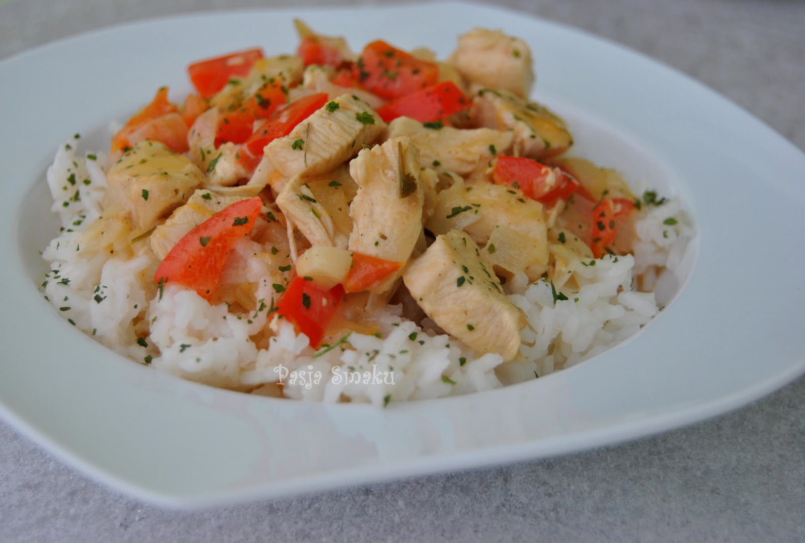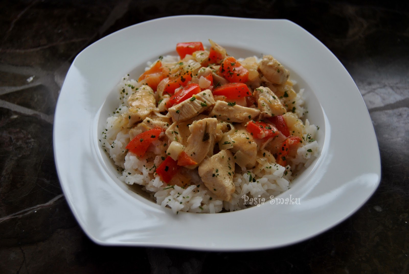 Podawać z ryżem. U mnie dodatkowo danie posypane suszoną pietruszką.