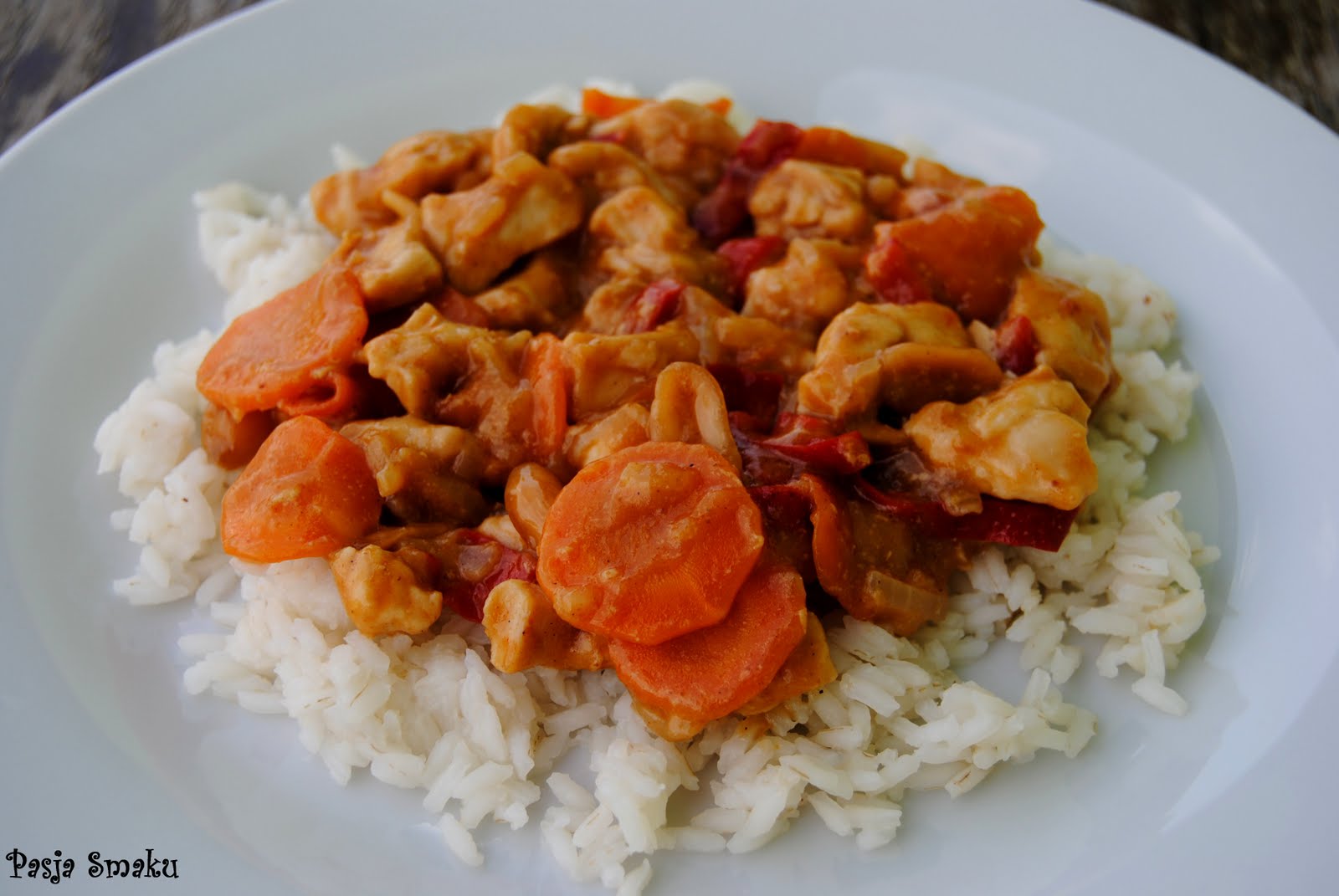 1. Kurczaka pokroić w dużą kostkę, cebulę i paprykę w paski, a marchewkę w plasterki. Wszystko razem smażyć na patelni przez 5 minut, mieszając co jakiś czas.