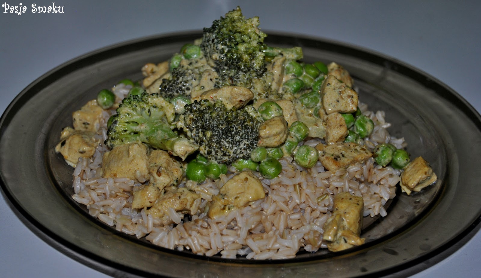 Jeden z moich studenckich obiadów typu: wykorzystywanie tego co mam w lodówce i zamrażalniku. Padło na kurczaka, kilka różyczek brokułów i woreczek mrożonego groszku. Chwila myślenia i buszowania w sieci i mam pomysł na obiad. Żeby zachować pozory zdrowego odżywiania, kurczaka podałam z brązowym ryżem.