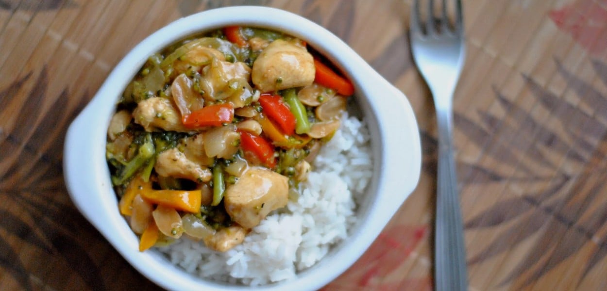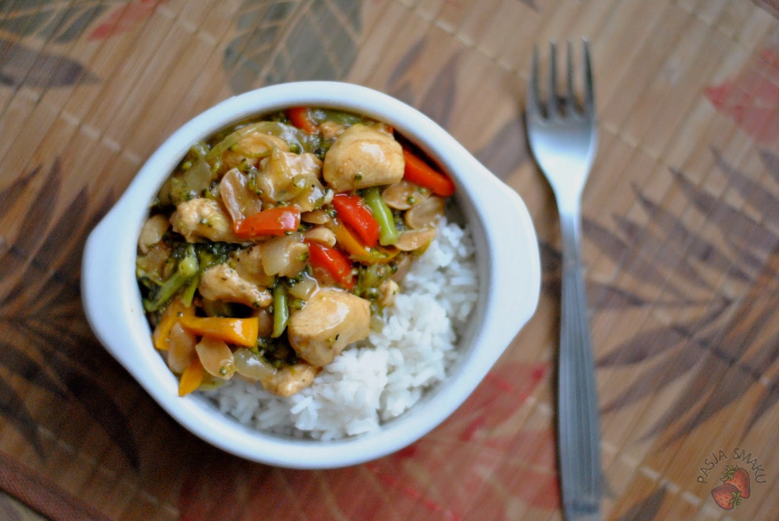 Kolorowe danie inspirowane kuchnią azjatycką. Pierś z kurczaka, brokuły, orzeszki ziemne, papryka i ryż. Bardzo łatwe do wykonania i trochę pikantne. Smacznego!