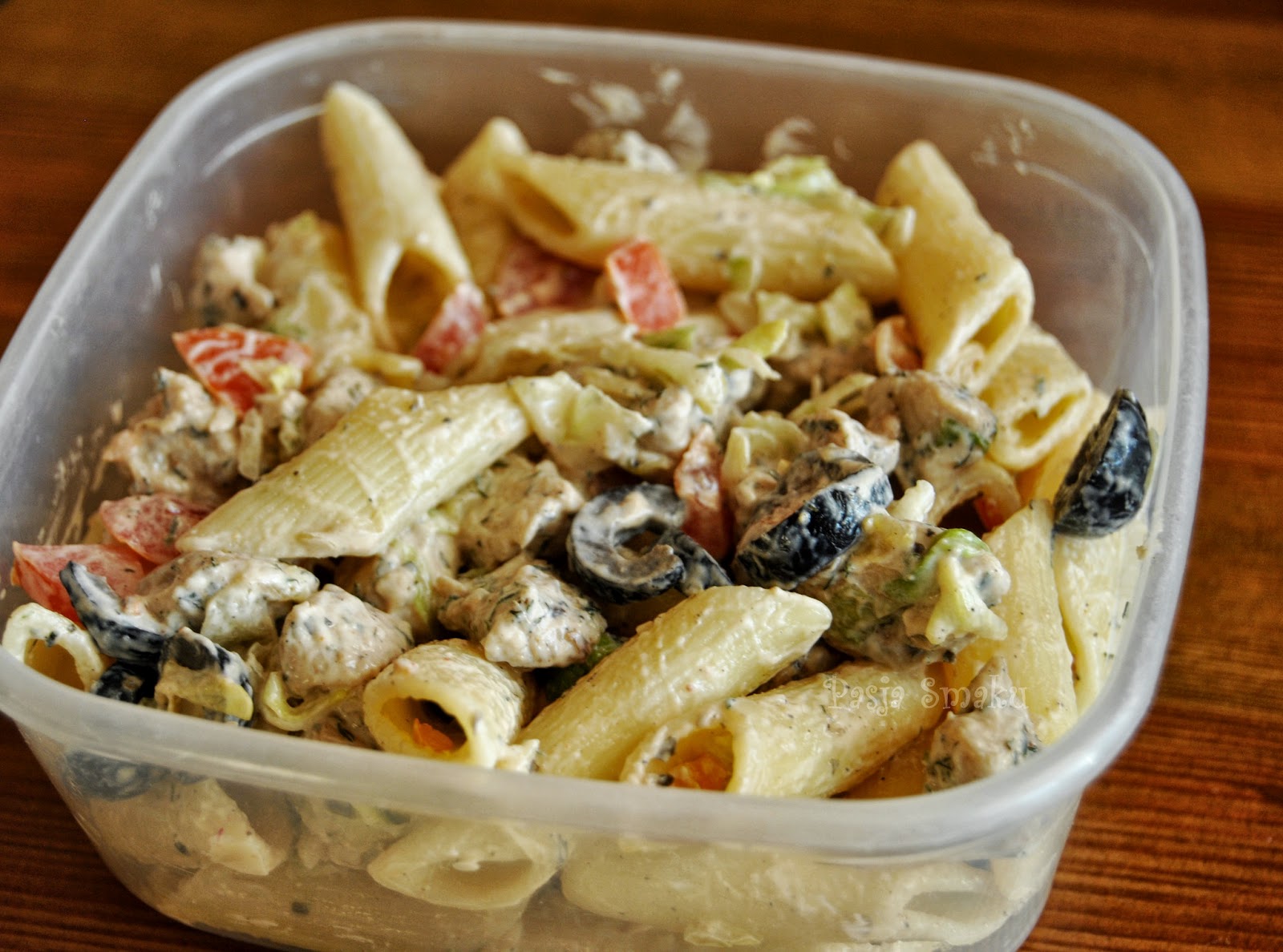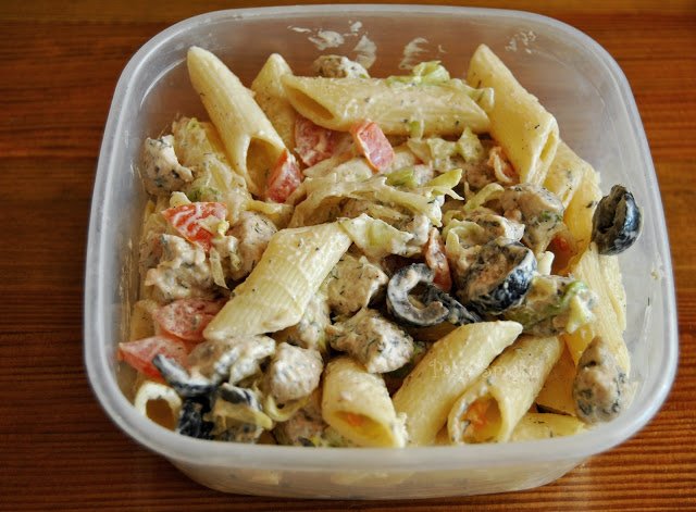 Ostudzonego kurczaka wymieszać w makaronem i warzywami. Doprawić do smaku i dodać majonez. Jeżeli sałatka robiona jest wieczorem, warto majonez dodać rano następnego dnia przed wyjściem do pracy.