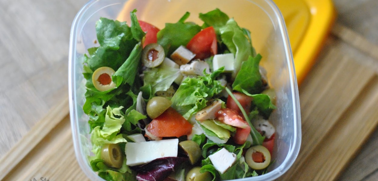 Czasem mam ochotę w pracy na coś lekkiego, dlatego przygotowałam sałatkę z grillowanym kurczakiem, mozzarellą, pomidorem i oliwkami. Do tego oliwa lub sos winegret i gotowe. W sam raz na lato.