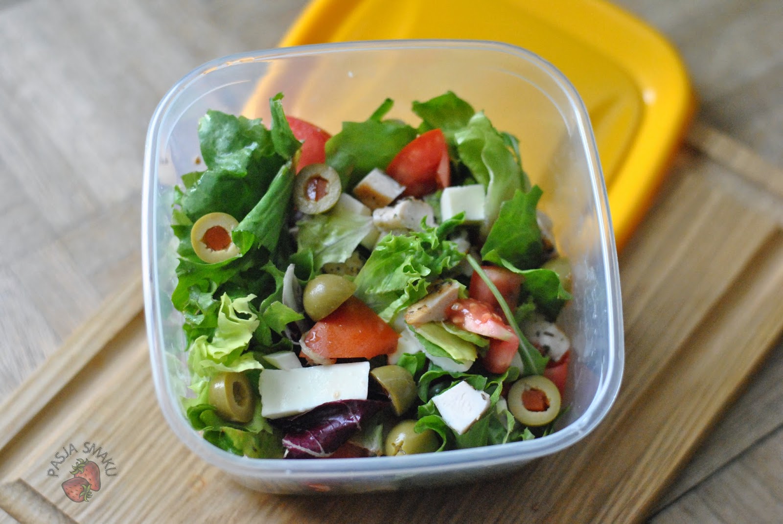 Czasem mam ochotę w pracy na coś lekkiego, dlatego przygotowałam sałatkę z grillowanym kurczakiem, mozzarellą, pomidorem i oliwkami. Do tego oliwa lub sos winegret i gotowe. W sam raz na lato.