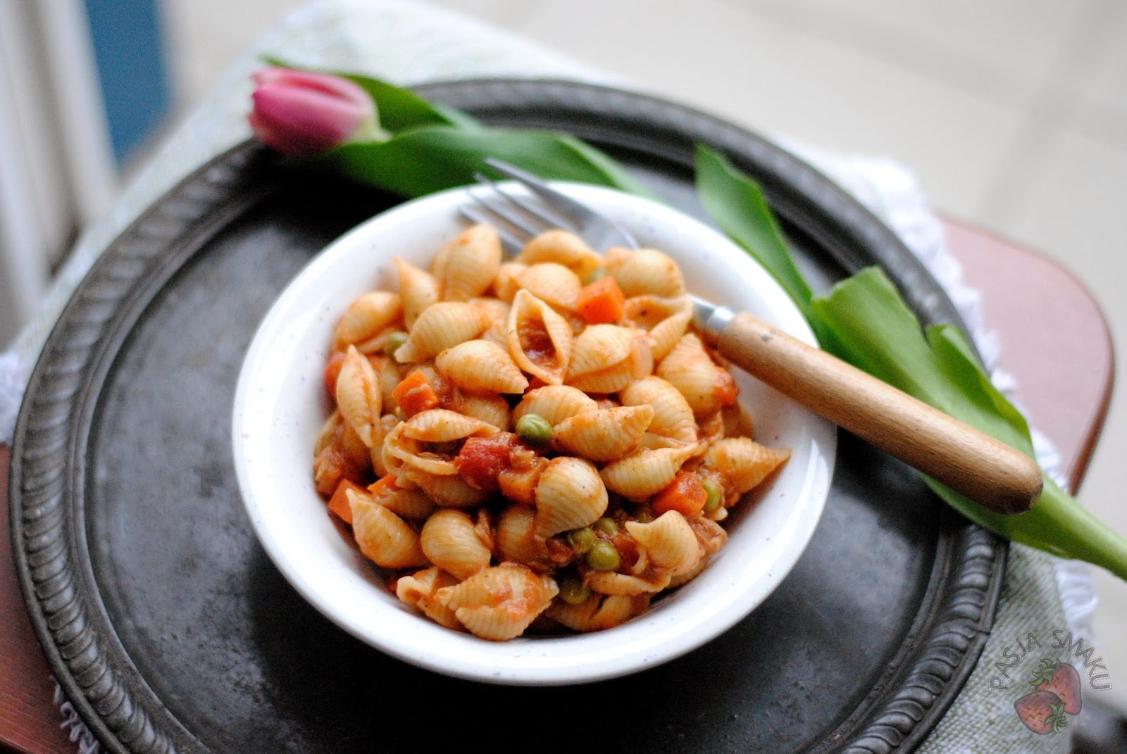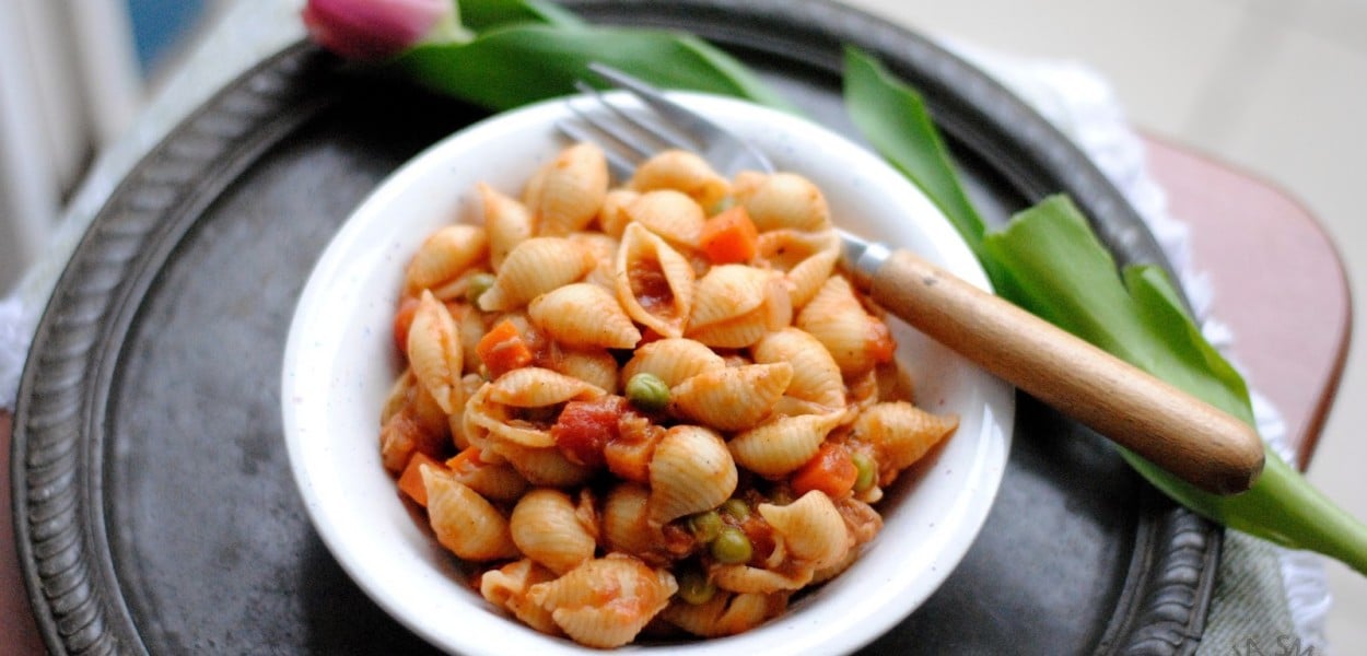 Kolejny makaron na szybko, z opcją wykorzystania zalegającej w zamrażalce mrożonki w postaci marchewki z groszkiem. Do tego pomidory i tuńczyk.
