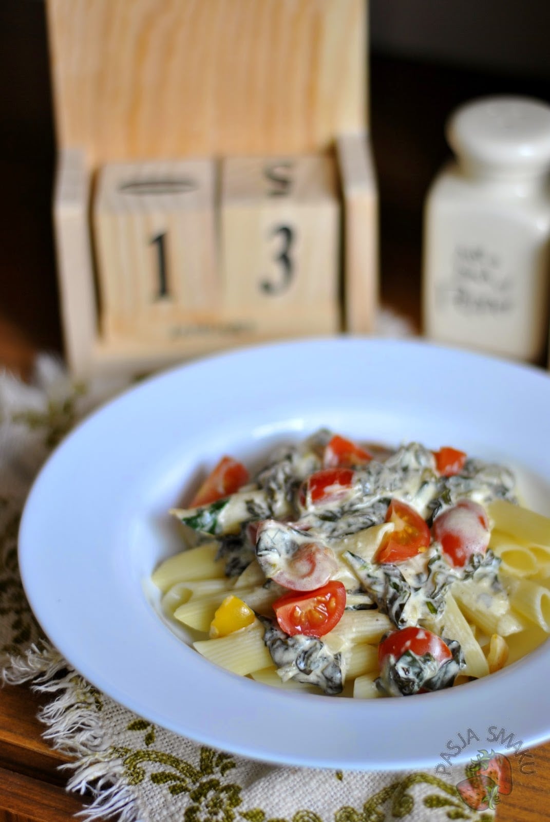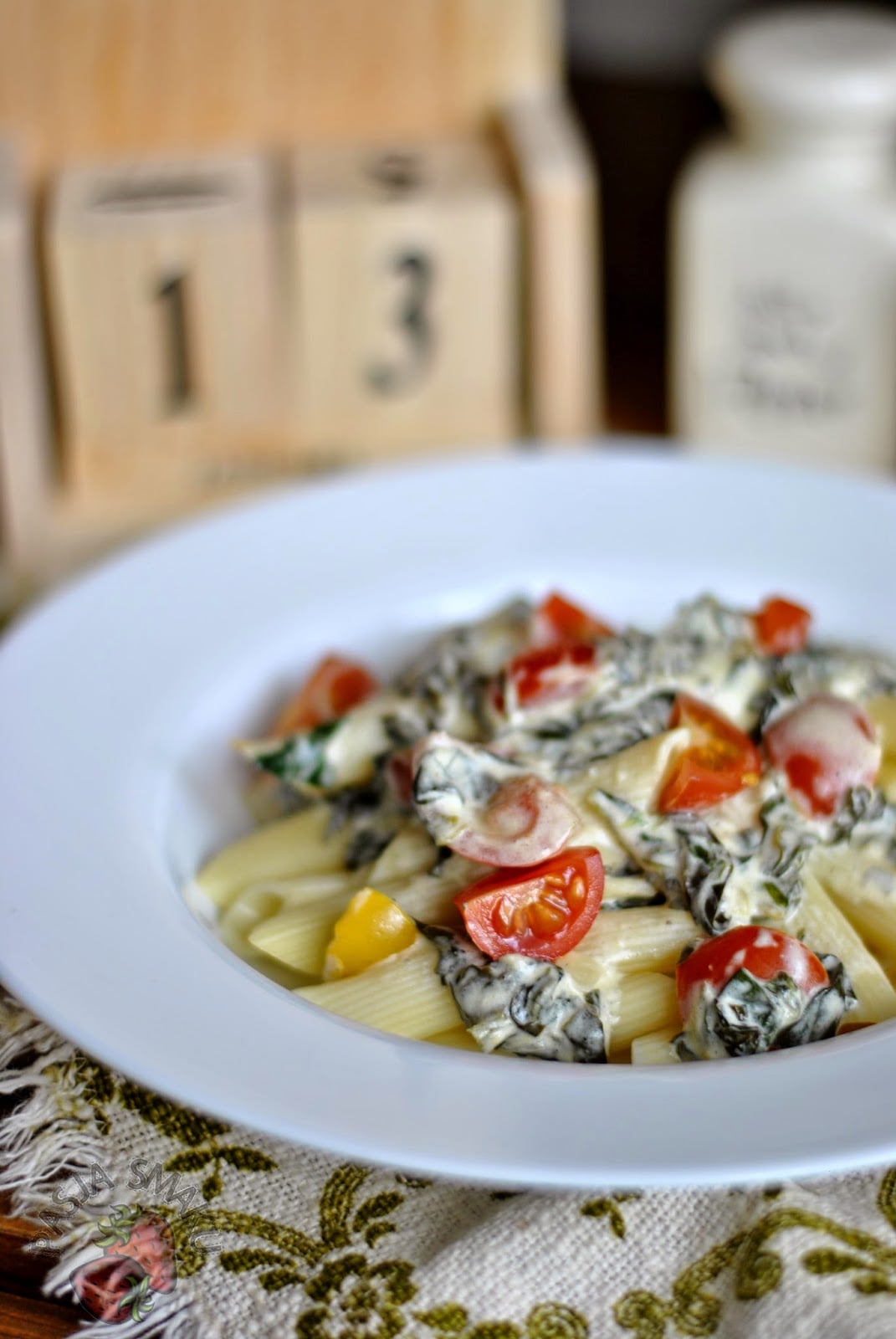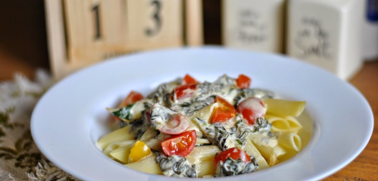 Pomysł na szybki obiad? Zdecydowanie makaron! U mnie ostatnio króluje szpinak – w każdej postaci. Niedługo dodam jeszcze pomysł na jajecznicę z jego dodatkiem. Dzisiaj jednak zdecydowałam się na makaron z pomidorkami koktajlowymi i sosem na bazie śmietany i jogurtu naturalnego. Danie można uzupełnić dowolnym serem, ale ja najchętniej wybrałabym pokruszony ser kozi.