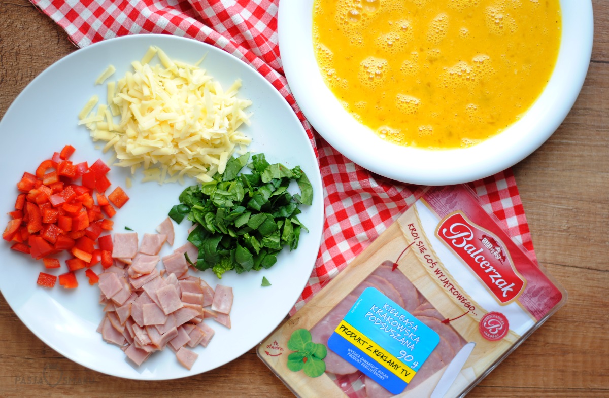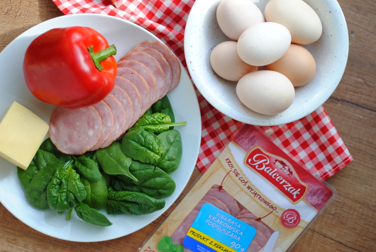 Paprykę i kiełbasę krakowską pokroić w kostkę, szpinak drobniej posiekać, ser zetrzeć na tarce, a jajka z dodatkiem przypraw rozmieszać widelcem.