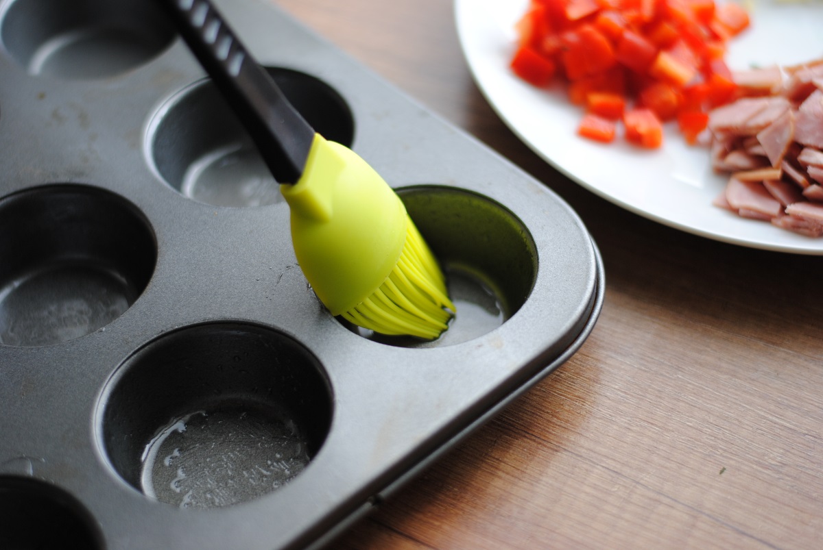 Następnie jajka połączyć z pokrojonymi składnikami. Otwory w formie do muffinek wysmarować olejem i nakładać porcje masy jajecznej do 3/4 wysokości. Muffinki podczas pieczenia urosną.