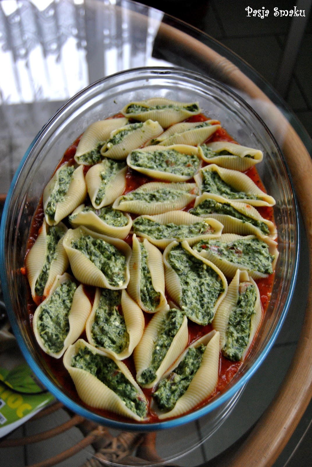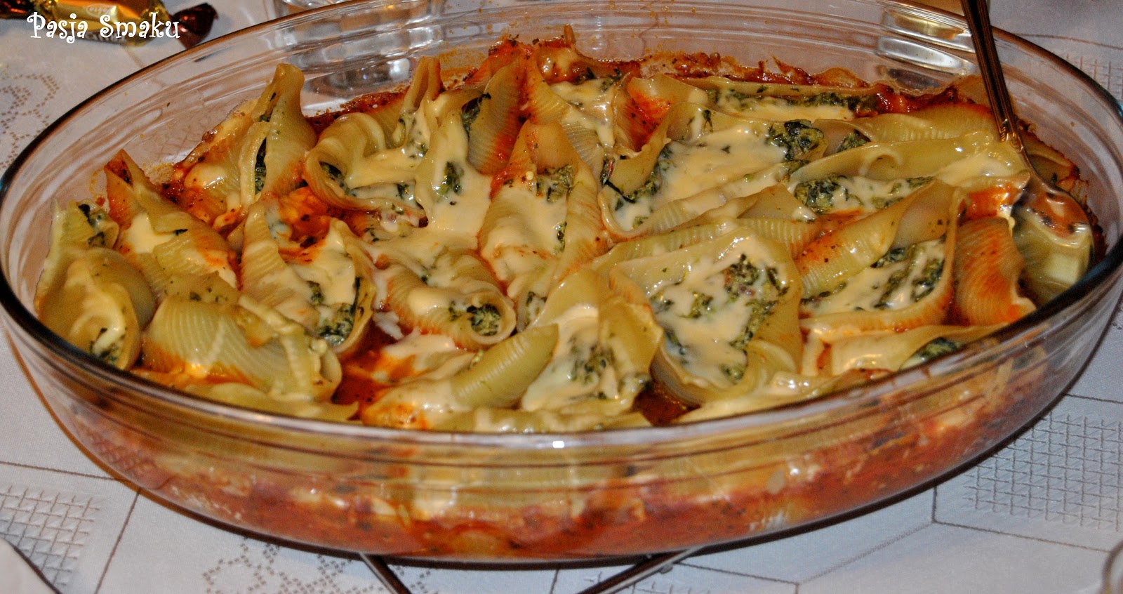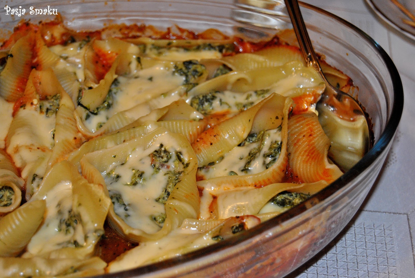 Łyżeczką napełniać makaron nadzieniem ze szpinaku i fety. Muszle układać na sosie pomidorowym. Całość posypać startym żółtym serem. Przykryć i piec w piekarniku nagrzanym do 180 st.C przez 20 minut.