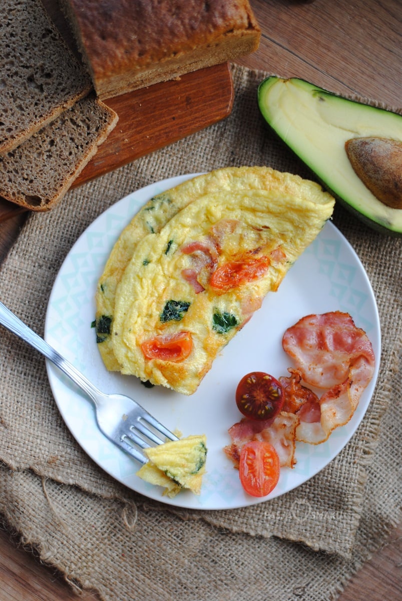 Omlet z boczkiem, szpinakiem i pomidorkami serwuję podczas weekendowych śniadań i czasem do moich lunchboxów. Omlety to pyszne i łatwe do przygotowania śniadania, które z przyjemnością zjada również moja córka.