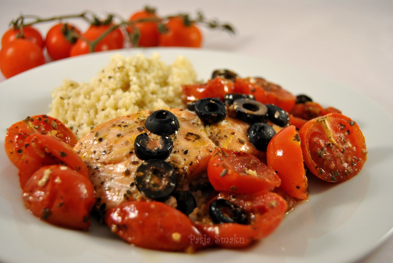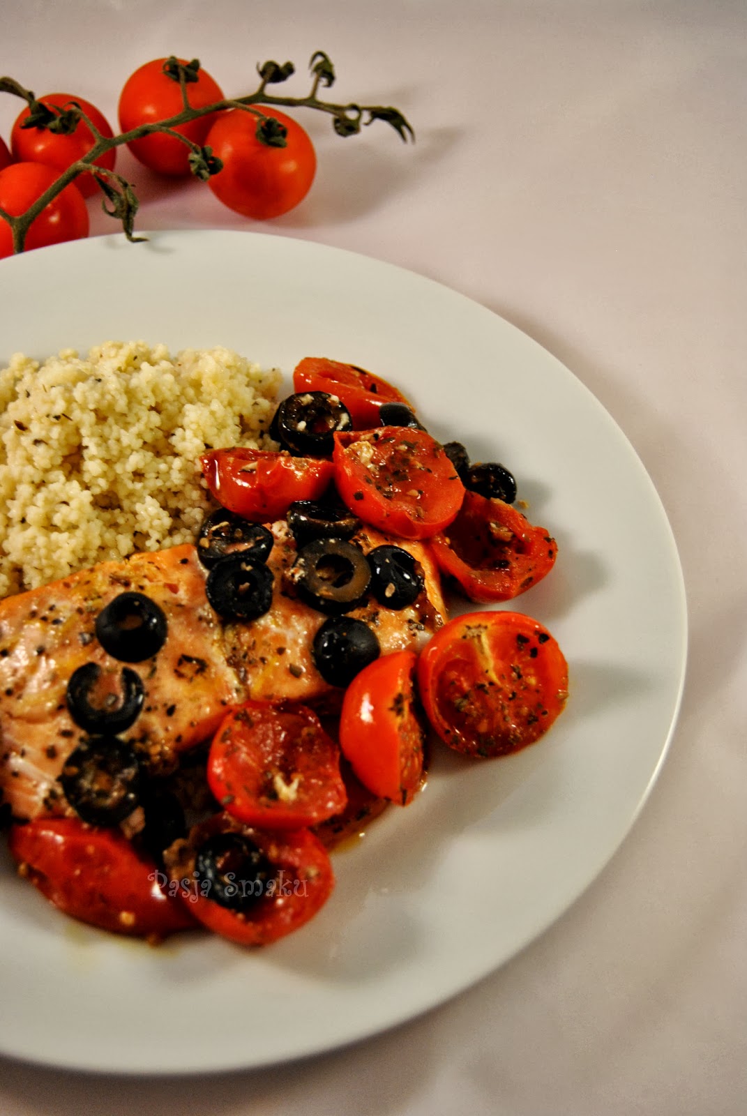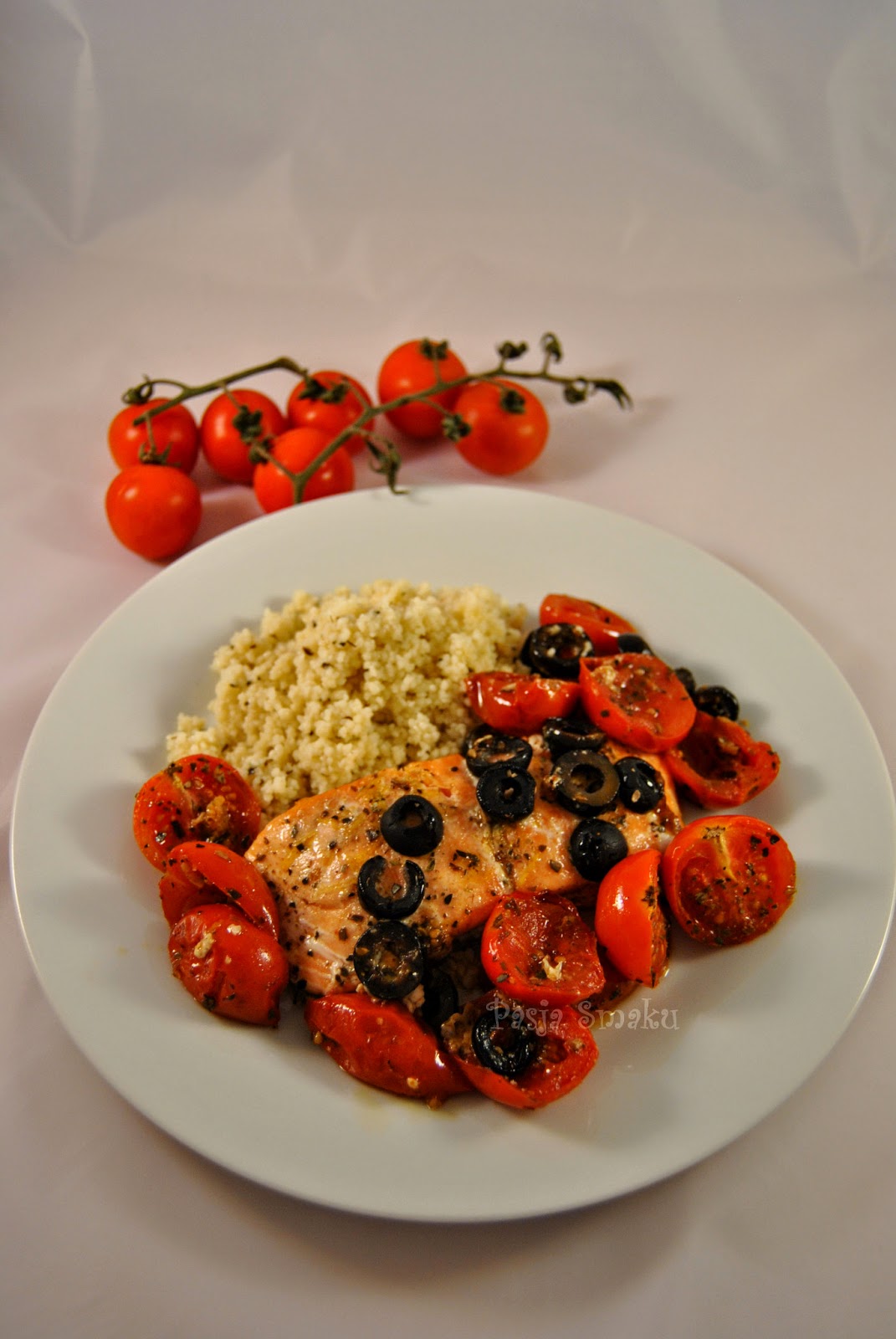 Łososia podawać z pomidorkami i kaszą kuskus lub innym ulubionym dodatkiem.