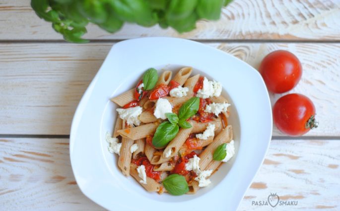 Znacie słynną sałatkę caprese? Dzisiaj mam dla Was przepis na pełnoziarnisty makaron caprese. Podobnie jak w sałatce bazujemy na prostych składnikach: pomidorach, mozzarelli, bazylii i oliwie. Nie można jednak zapomnieć o dodatku makaronu, dzięki któremu ta wersja staje się pożywna