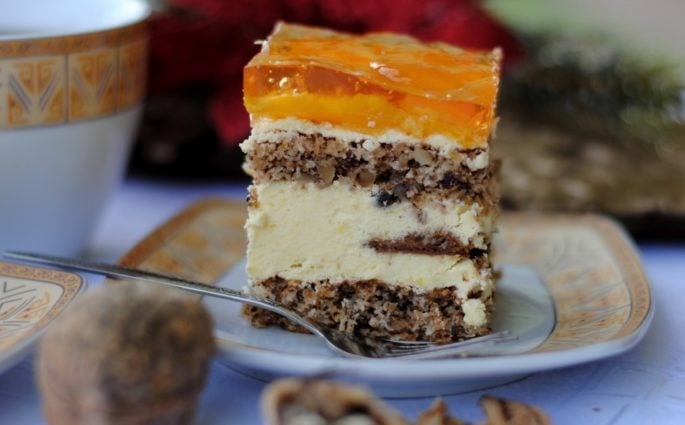 Jedno z naszych tegorocznych świątecznych ciast. Wymaga trochę pracy, jak każde ciasto warstwowe, ale zapewniam, że naprawdę warto! Przy jego przygotowaniu miałam niewielki udział, bo tylko orzechy zmieliłam, a całość wykonała Mama. Ciasto bardzo smaczne, w sam raz zarówno do