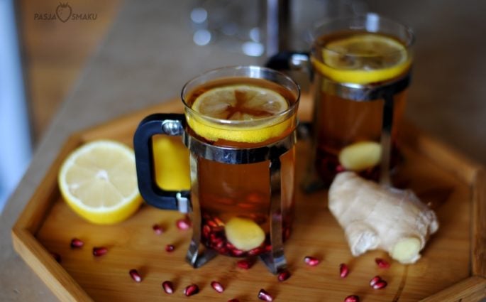 Jesień za oknami sprawia, że coraz częściej decydujemy się na rozgrzewające napoje. U mnie króluje czarna herbata z cytryną i miodem. Zielona herbata z granatem i imbirem to dobry pomysł na coś nowego i ciekawego do picia. Z dodatkiem cytryny