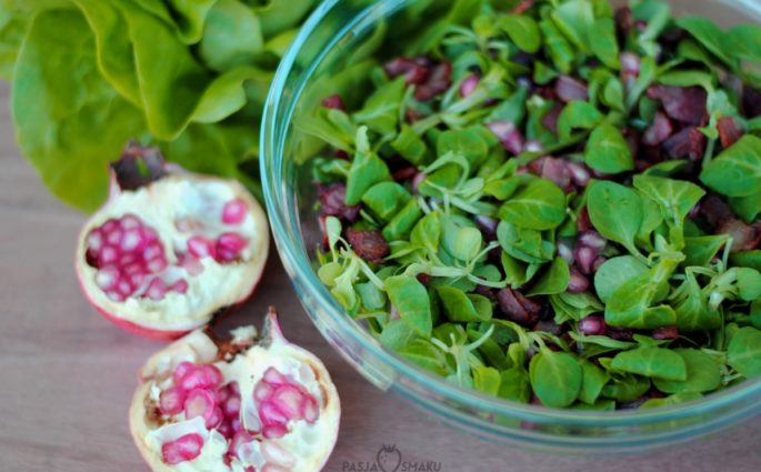 Przepis na tę sałatkę siostra dostała od koleżanki. Przygotowuje się ją bardzo szybko i wystarczy tylko kilka składników, by przygotować ją na przyjazd niespodziewanych gości. Lekka i świeża sałatka z roszponką i granatem doskonale komponuje się z sosem miodowo-musztardowym.