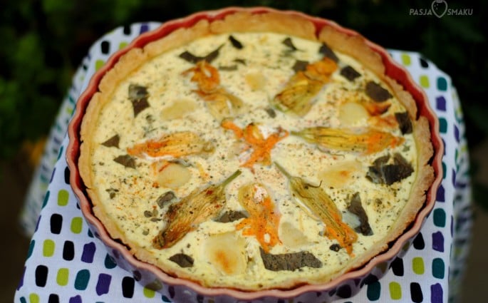 Od ubiegłego roku bardzo polubiłam kwiaty cukinii. Są niezwykle delikatne, można je zarówno smażyć, jak i piec. Szczególnie pyszne są te faszerowane serkiem z pikantnymi przyprawami. Ten pomysł wykorzystałam w wytrawnej tarcie z kwiatami cukinii. Smacznego! Składniki: Ciasto: