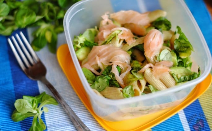 Dzisiaj propozycja FIT – prosto na wiosnę. Niewielka ilość makaronu pełnoziarnistego, dojrzałe awokado, wędzony łosoś i roszponka. Lekko i pysznie, a propozycja zadowoli nawet mężczyzn. Danie wędruje do kategorii Lunchbox. Smacznego!