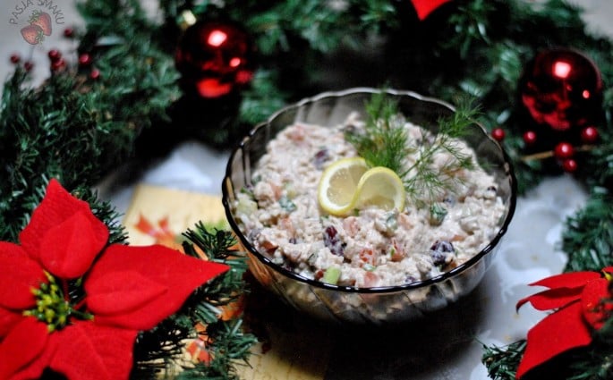 Długo była naszą ulubioną sałatką, ale się „przejadła”. Teraz najczęściej robimy ją na Wigilię. Z podanych proporcji wychodzą dwie salaterki. Mnie urzeka w niej lekko kwaskowaty posmak, cytryny który neutralizuje słodycz majonezu i doskonale komponuje się z tuńczykiem. Ryż dodaje