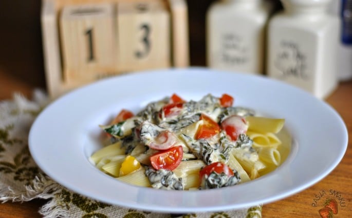 Pomysł na szybki obiad? Zdecydowanie makaron! U mnie ostatnio króluje szpinak – w każdej postaci. Niedługo dodam jeszcze pomysł na jajecznicę z jego dodatkiem. Dzisiaj jednak zdecydowałam się na makaron z pomidorkami koktajlowymi i sosem na bazie śmietany i jogurtu
