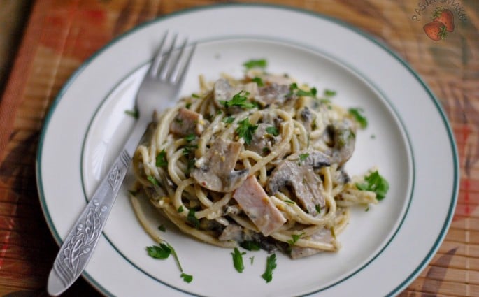 Spaghetti z pieczarkami i szynką