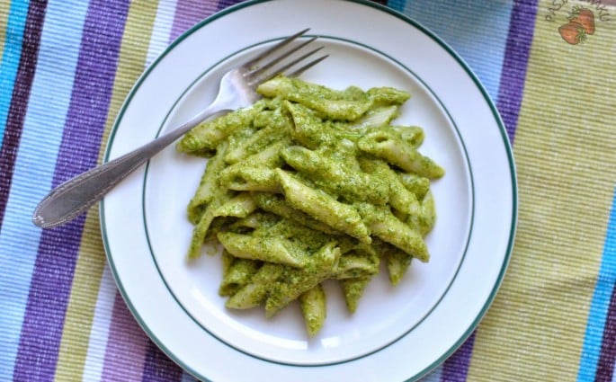 Problem z zalegającą w lodówce rukolą? Pesto! Jeden z szybszych i łatwiejszych do przygotowania obiadów w moim życiu. Nie zastanawiajcie się, tylko gotujcie! Składniki: 1/2 opakowania makaronu penne 2 garści rukoli 60 g orzeszków ziemnych 2 ząbki czosnku 80 ml
