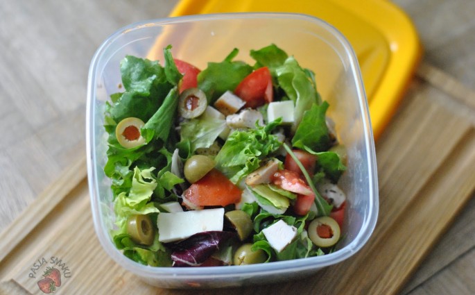 Czasem mam ochotę w pracy na coś lekkiego, dlatego przygotowałam sałatkę z grillowanym kurczakiem, mozzarellą, pomidorem i oliwkami. Do tego oliwa lub sos winegret i gotowe. W sam raz na lato. Składniki: 2 garście mieszanki sałat 1/2 kulki mozzarelli 1/2