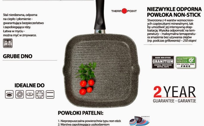 Wczoraj miałam okazję przetestować grillową patelnię z z linii Granitium. Granitowa patelnia prezentuje się naprawdę dobrze, ma odpowiednią wagę i kształt. Kiedyś miałam okrągłą, ale kwadratowa sprawdza się zdecydowanie lepiej. Na pierwszy rzut oka widać także wskaźnik temperatury THERMOPOINT, który