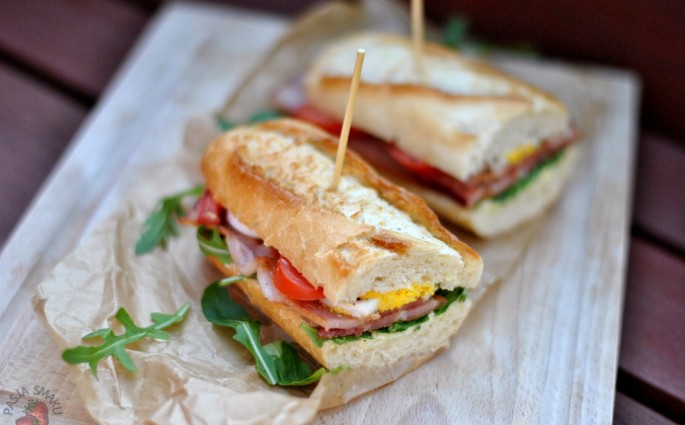 Dziś proponuję Wam sposób zaserwowania ładnego śniadania. Któż nie chciałby zjeść tak podanej bagietki? Idealnie pasuje także na lunch do pracy czy kolację. Składniki: 1 bagietka 2 plastry wędzonego łososia 2 plastry żółtego sera garść rukoli masło majonez sok z