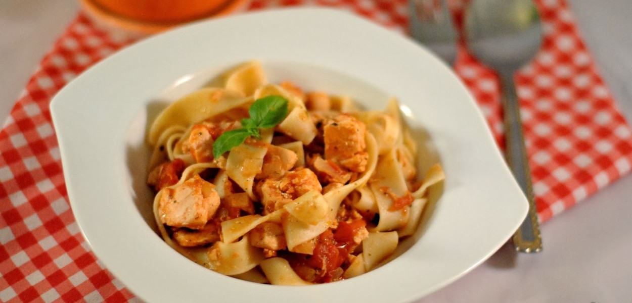 Wieczór i brak pomysłu na kolację. Szybki przegląd lodówki i półek w spiżarni i mam pomysł – szybki makaron z łososiem i pomidorami. W okresie letnim polecam pomidory z puszki zastąpić świeżymi.